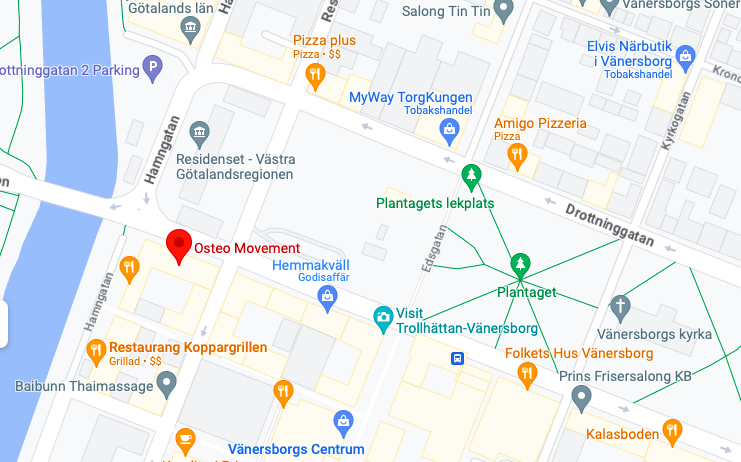 Osteo Movement hittar du på Kungsgatan 1 i Vänersborg. På torget tvärs över gatan finns det fria parkeringsplatser för 2-3 timmar (använd P-skiva).